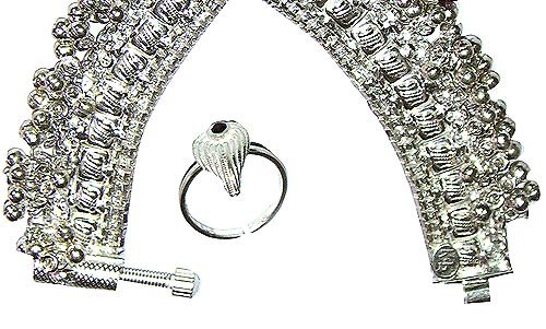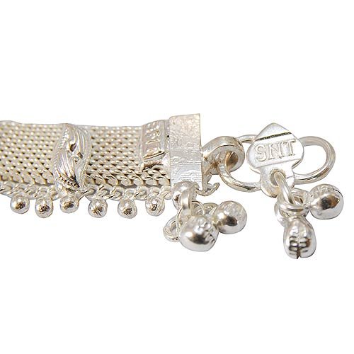 There are two basic types of this exquisite foot jewelry, the stiff and the flexible. Stiff anklets are either fabricated or cast by shaping and hammering sheet metals into various shapes. The artisanal techniques of chiseling, engraving, threading, granulation, chain techniques, and wire work make this handmade jewelry an exceptional piece of fine art. More commonly referred to as pajeb or jhanjhar, this flexible variety of employing a close interlocking technique is further enhanced with enticing jingle bells. It has been said that there is no better music to a lover's ears than the seductive sound coming from the steps being taken by his beloved. This beautiful sound has been a constant subject in Indian poetry for several centuries now.