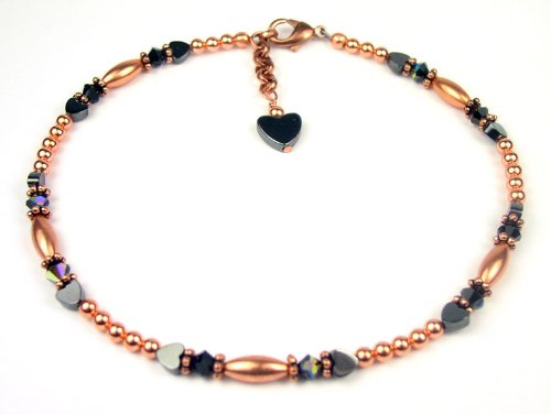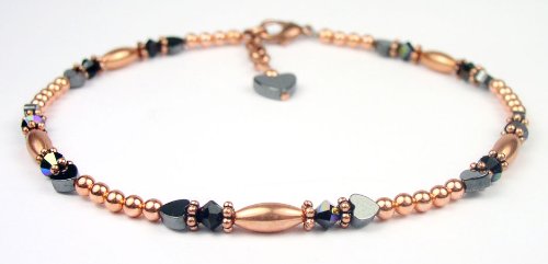 Copper Beaded Anklets and Ankle Bracelets. Not only do they look GREAT with a tan....everyone knows that pure untreated copper has been used to help relieve arthritis pain for centruies. Well, this is NOT your grandma's old fashioned copper jewelry! Stylish and smart, we've paired copper with Hematite (a rich blood stone) for added oxyen and used Swarovski crystals for just a touch of color. This quality crafted piece of jewelry contains no plastic, no pewter, and no plated materials. I use the finest materials available. I want to offer an anklet you would be proud to give and she would be proud to wear. And of course, when you give her SWAROVSKI, you give her the best! These handmade beaded copper ankle bracelets are handcrafted with genuine Swarovski Austrian crystals, pure copper accents, copper lobster clasp and hematite heart shaped gemstone dangle. Adjustable so that you can wear it all year round, over your ankle bone with skirts, or below your ankle bone with slacks and jeans. Handcrafted one at a time in our New Jersey USA Studio for GemstoneGifts Handmade Jewelry by designer Shirley L. Gordon.