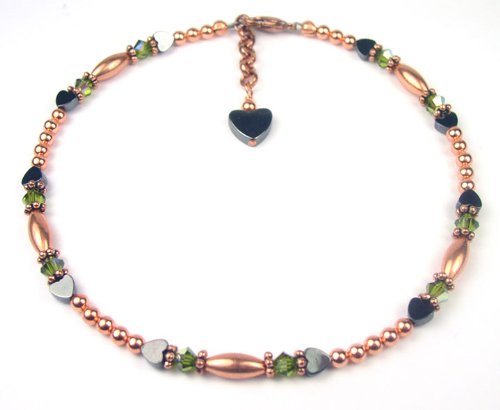 Copper Beaded Anklets and Ankle Bracelets. Not only do they look GREAT with a tan....everyone knows that pure untreated copper has been used to help relieve arthritis pain for centruies. Well, this is NOT your grandma's old fashioned copper jewelry! Stylish and smart, we've paired copper with Hematite (a rich blood stone) for added oxyen and used Swarovski crystals for just a touch of color. This quality crafted piece of jewelry contains no plastic, no pewter, and no plated materials. I use the finest materials available. I want to offer an anklet you would be proud to give and she would be proud to wear. And of course, when you give her SWAROVSKI, you give her the best! These handmade beaded copper ankle bracelets are handcrafted with genuine Swarovski Austrian crystals, pure copper accents, copper lobster clasp and hematite heart shaped gemstone dangle. Adjustable so that you can wear it all year round, over your ankle bone with skirts, or below your ankle bone with slacks and jeans. Handcrafted one at a time in our New Jersey USA Studio for GemstoneGifts Handmade Jewelry by designer Shirley L. Gordon.