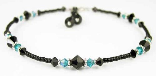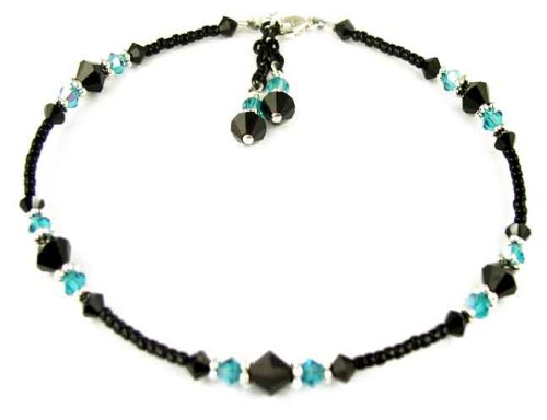 December - Blue Zircon Birthstone Jewelry: This is just about as sexy and fashionable as an anklet can get! Sleek and daring with double jet black crystals dangling from a short black chain set into motion with each step. She can't wear this anklet and not feel a little prettier, a little sexier, a little sassy, a little more saucy. And wait! Did you notice that tiny shimmer of color? Its personalized with her birthstone! Picture these little black accents with a little black cocktail dress, black pant suit, black jeans, black heels, black anything, and you have a recipe for a smile. Dont be surprised if you get a THANK YOU kiss for this one! When you give her SWAROVSKI, you give her the best! Nothing shines, sparkles, or dazzles like genuine Swarovski Crystal. These handmade beaded ankle bracelets are handcrafted with .925 Sterling Silver accents including sterling lobster clasp closure. One inch adjustable extension so she can wear it all year round, over the ankle bone with skirts, or under the ankle bone to peek out below slacks and jeans. GemstoneGifts Handmade Jewelry is handcrafted one at a time in our New Jersey USA Studio by jewelry artist Shirley L. Gordon.