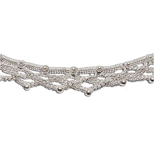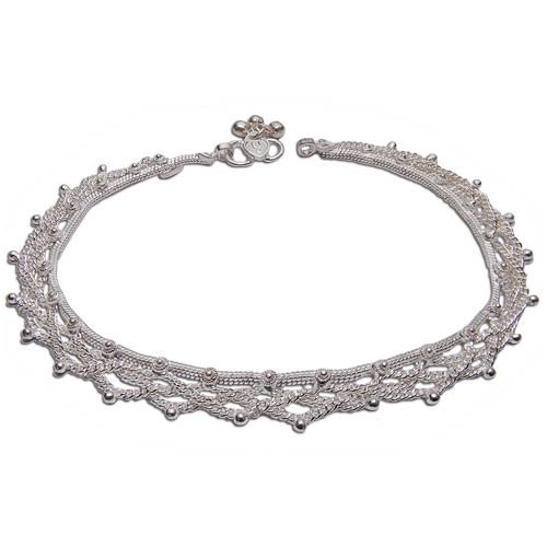 Throughout India anklets, worn in pairs, one on each ankle, are common, though not all function as marriage ornaments. Among the poorer people and especially among more isolated communities it is common to find anklets of base metals like white metal, copper, and copper alloys such as brass and bronze. However, in most places, anklets are made in silver. Anklets are of two basic types, i.e. the stiff and the flexible. The stiff anklets are either cast or fabricated by hammering sheet metal into the requisite shape. Using the techniques of chiseling, engraving, repousse, granulation or threading and wire work, anklets are patterned. The flexible variety employs close interlocking of separately made links tied together either by using variations of chain technique or by threading together of links. Known as jhanjhar or pajeb, the flexible variety is often further adorned with jingle bells. There is no better music to the ears of a lover than the jingling sound arising from the steps of the beloved. This has been a subject of innumerable poetic stanzas in Indian literature over several centuries.