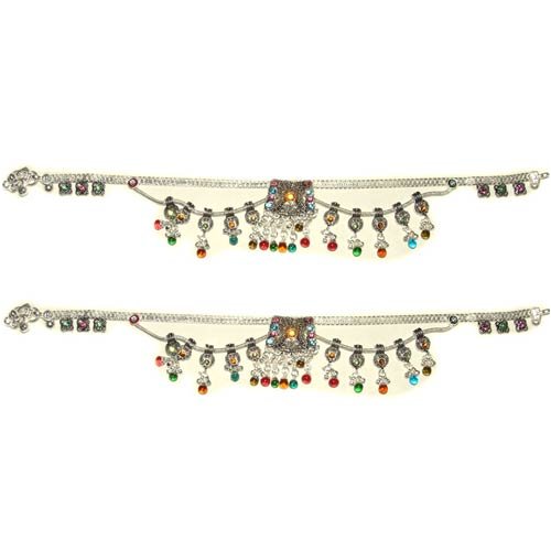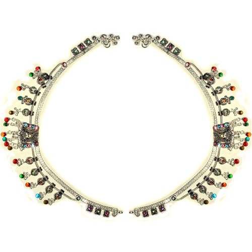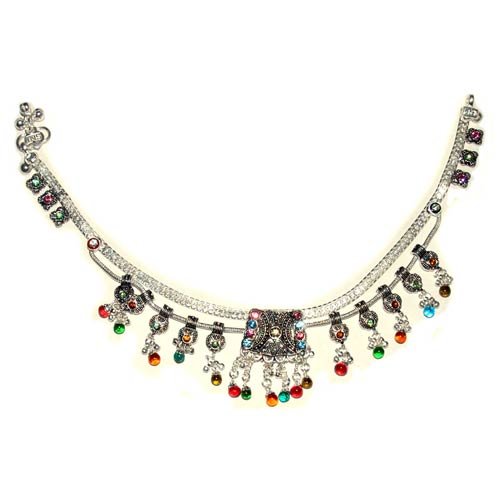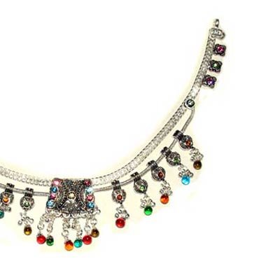 Throughout India anklets, worn in pairs, one on each ankle, are common, though not all function as marriage ornaments. Among the poorer people and especially among more isolated communities it is common to find anklets of base metals like white metal, copper, and copper alloys such as brass and bronze. However, in most places, anklets are made in silver. Anklets are of two basic types, i.e. the stiff and the flexible. The stiff anklets are either cast or fabricated by hammering sheet metal into the requisite shape. Using the techniques of chiseling, engraving, repousse, granulation or threading and wire work, anklets are patterned. The flexible variety employs close interlocking of separately made links tied together either by using variations of chain technique or by threading together of links. Known as jhanjhar or pajeb, the flexible variety is often further adorned with jingle bells. There is no better music to the ears of a lover than the jingling sound arising from the steps of the beloved. This has been a subject of innumerable poetic stanzas in Indian literature over several centuries.