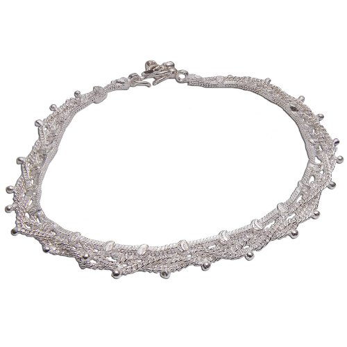 Throughout India anklets, worn in pairs, one on each ankle, are common, though not all function as marriage ornaments. Among the poorer people and especially among more isolated communities it is common to find anklets of base metals like white metal, copper, and copper alloys such as brass and bronze. However, in most places, anklets are made in silver. Anklets are of two basic types, i.e. the stiff and the flexible. The stiff anklets are either cast or fabricated by hammering sheet metal into the requisite shape. Using the techniques of chiseling, engraving, repousse, granulation or threading and wire work, anklets are patterned. The flexible variety employs close interlocking of separately made links tied together either by using variations of chain technique or by threading together of links. Known as jhanjhar or pajeb, the flexible variety is often further adorned with jingle bells. There is no better music to the ears of a lover than the jingling sound arising from the steps of the beloved. This has been a subject of innumerable poetic stanzas in Indian literature over several centuries.