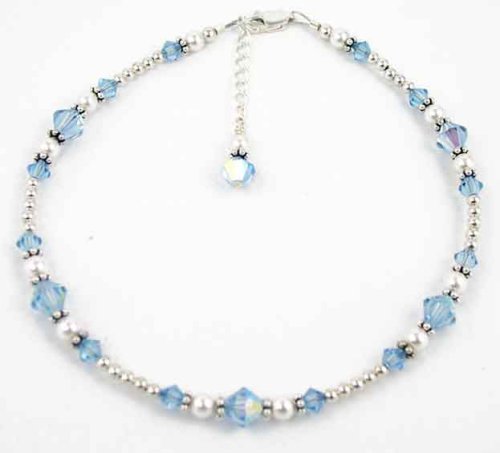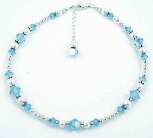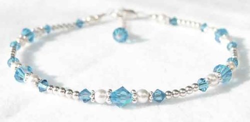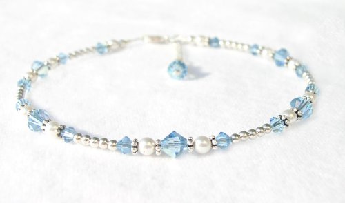 March - Aquamarine Birthstone Sterling Silver Anklets. Pearls and Swarovski Crystal Beaded Ankle Bracelets. Shining silver, classic pearls, a bit of Swarovski dazzle go from the office, to the restaurant, or the beach! These handmade beaded ankle bracelets are handcrafted with genuine Swarovski Austrian crystals, .925 Sterling Silver accents, swarovski crystal pearls, .925 sterling lobster clasp closure and darling crystal charm dangle. Adjustable as much as one inch, so that you can wear it all year round, over your ankle bone with skirts, or under your ankle bone with slacks and jeans. Gemstone Gifts Handmade Jewelry is handcrafted one at a time in our New Jersey USA Studio by jewelry artist Shirley L. Gordon.