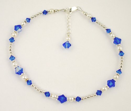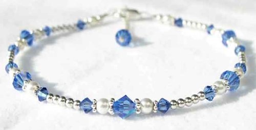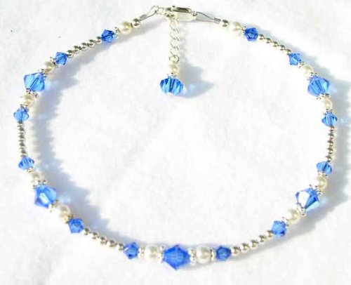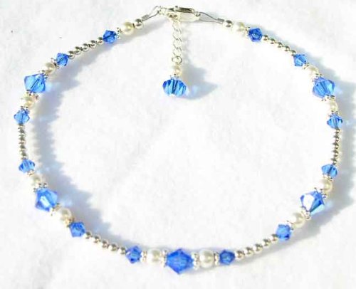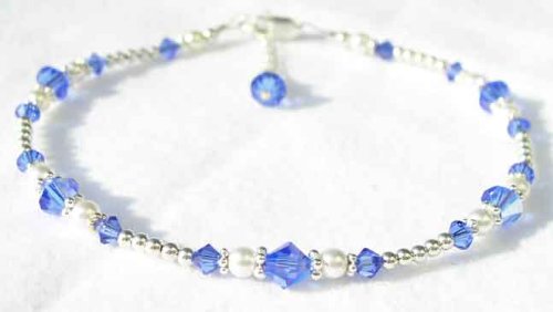 September - Sapphire Birthstone Jewelry: .925 Sterling Silver, Pearls, and Swarovski Crystal Beaded Anklets/Ankle Bracelets. A shining strand of silver, a touch of classic pearls, a bit of Swarovski dazzle! There is no place this little darling can not go,from the office, to the restaurant, or the beach! This anklet is a very nice, quality crafted peice of jewelry. It contains no plastic, no glass, no pewter, and no plated materials. I used the finest materials that are available. I wanted to offer an anklet that you would be proud to give and she would be proud to wear. And of course, when you give her SWAROVSKI, you give her the best! Nothing shines, sparkles, or dazzles like genuine Swarovski Crystal. These handmade beaded ankle bracelets are handcrafted with genuine Swarovski Austrian crystals, .925 Sterling Silver accents, and swarovski crystal pearls, .925 sterling lobster clasp closure and darling crystal and pearl charm dangle. Adjustable as much as one inch, so that you can wear it all year round, over your ankle bone with skirts, or under your ankle bone with slacks and jeans. Custom sizing is available. 1-856-985-3622. Exchange/re-sizing information included with every order. We want you to love your new GemstoneGifts Handmade Jewelry. Handcrafted one at a time in our New Jersey USA Studio by designer Shirley L. Gordon.