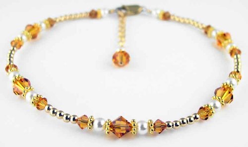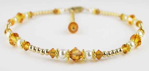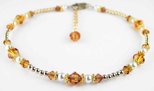 Swarovski Crystal Golden Topaz November Birthstone : 14K Gold Filled Beaded Anklets/Ankle Bracelets with 22K vermeil spacers, pearls, and Swarovski crystal. The dainty flashes of gold and the sparkle of color around her ankle will make her feel like a princess as she strolls thru the room. The value of gold is timeless, her personal birthstone adds a bit of tradition. And of course, when you give her SWAROVSKI, you give her the best! Nothing shines, sparkles, or dazzles like genuine Swarovski Crystals. These handmade beaded ankle bracelets are handcrafted with 100% Genuine Swarovski Austrian crystals, 22Kt vermeil accents, swarovski crystal pearls, 14K Gold lobster clasp closure and the darling crystal and pearl charm dangles from a 14K gold chain. Adjustable as much as one inch, so that you can wear it all year round, over your ankle bone with skirts, or below your ankle bone with slacks and jeans. GemstoneGifts Handmade Jewelry is handcrafted one at a time in our New Jersey USA Studio by jewelry artist Shirley L. Gordon.