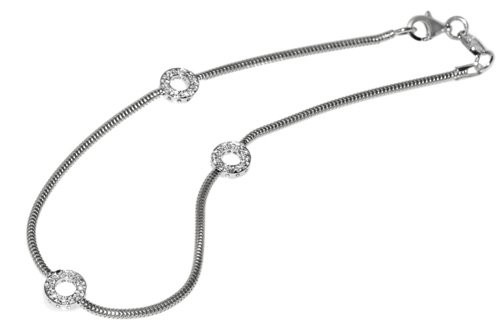 This gorgeous 14 karat white gold 10" Snake anklet bracelet is beautifully set with three open circle stations, enhanced with 0.18 Carat of pave set diamonds.