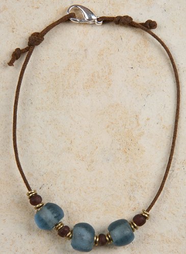 Blue Recycled Glass beads are featured on this anklet. The strong cotton cord is knotted and secured to the lobster claw style clasp. Length is approx 9.5 inches. Accented with small brass beads.