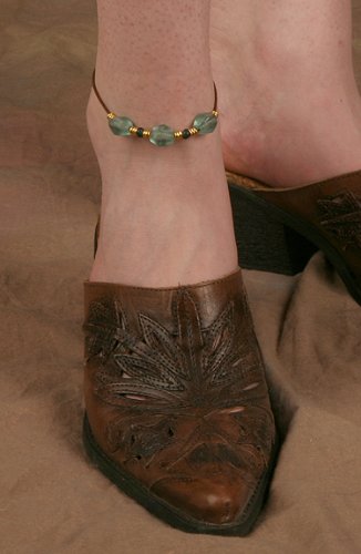 Indonesian Recycled Glass and brass beads are featured on this 9.5 inch anklet. The strong cotton cord is knotted and accented with black glass beads. A strong lobster claw style clasp is used for the closure. The beads are Indonesian, the anklet is made in USA.